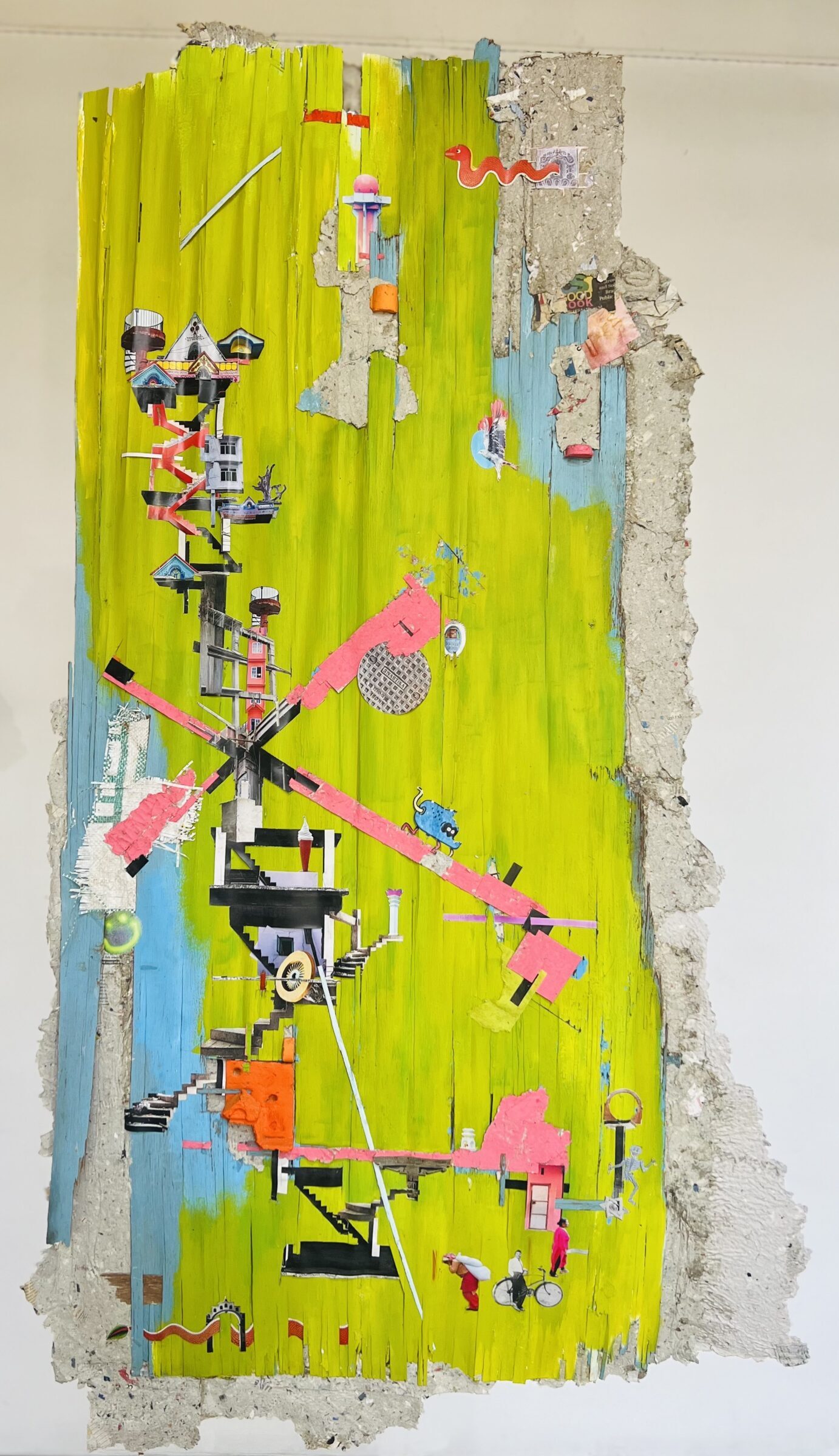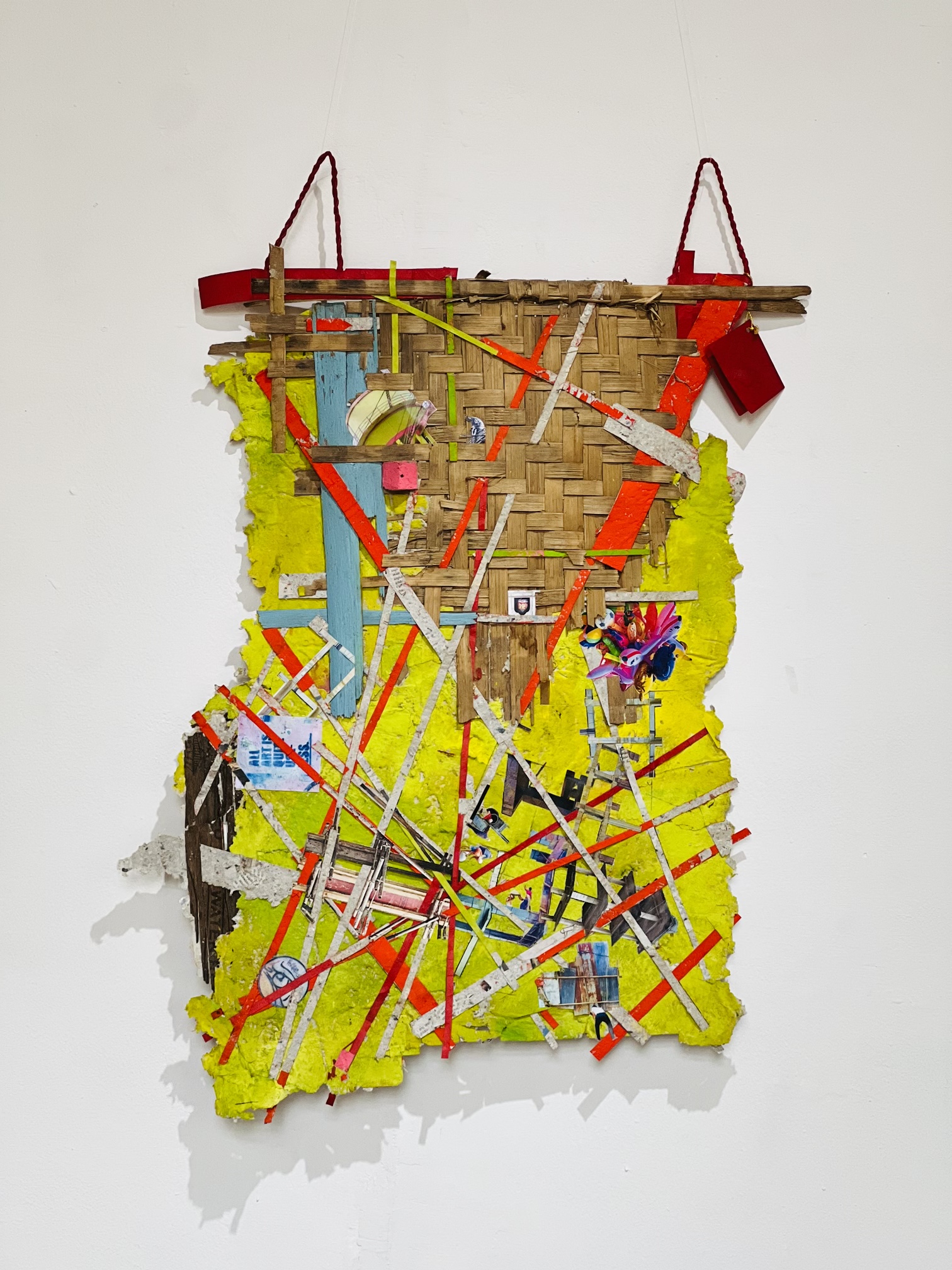 Crooks is primarily a sculptor – he has worked with the unyielding materials of steel and concrete. These physical methods have been transferred to working with the more pliable mediums of clay and collage. Always moving on and continuing exploration, paper-making has become the central process for his residency at Gallery Mcube. Into the pulp of the paper mush he has impressed fragments from his surroundings, leaving his own traces. His countryman Mallory when asked why he wanted to climb the mountain replied ‘Because it’s there’. This is a motivation behind Crooks work – to experience a place because it is there. However, Crooks selects the places that offer distinct and unique cultural interaction. His artwork is an exchange between fellow travellers and the paths that they follow.