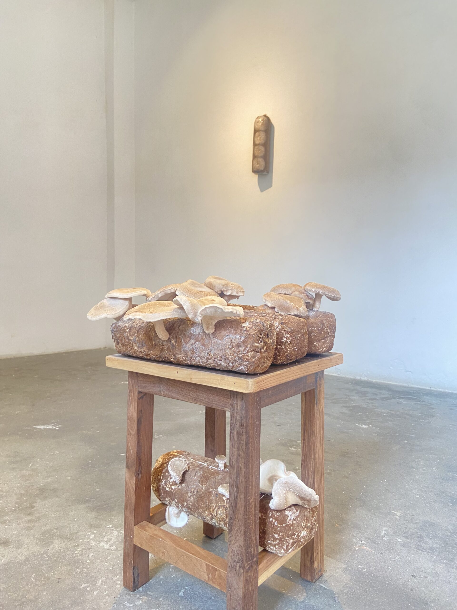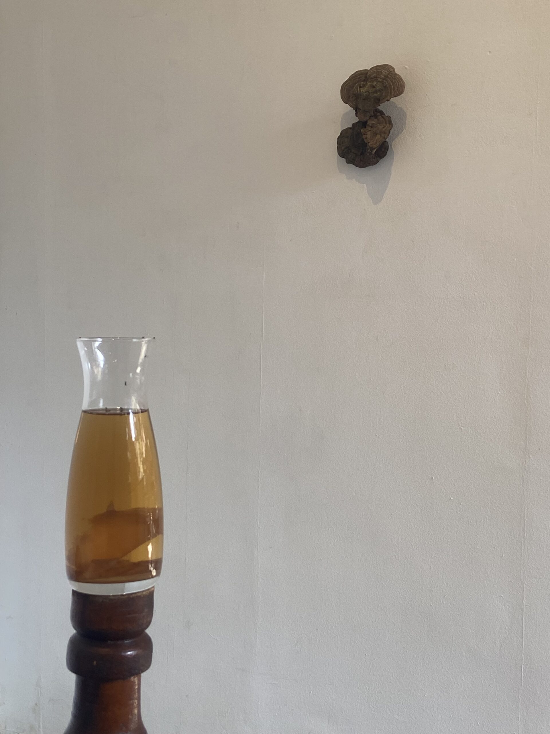 In collaboration with Rukshana Thapa, an ambitious mushroom researcher from Nepal, Anita Fuchs explores the fascinating world of Cordyceps mushrooms, showcased as mini sculptures. As part of the installation, mushrooms are grown within the gallery space, and Kombucha, fermented tea made from Reishi, is also featured as a part of her installation art.